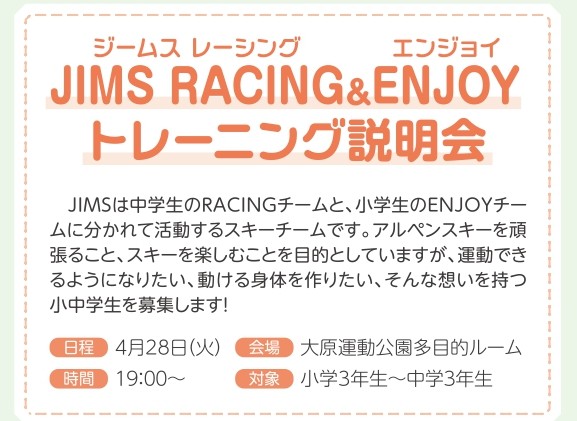 ジームスレーシングでは、怪我をしない体作り、技術向上、大会、記録会の成績向上を目指すため1年間を通して取り組んでいます。単にスキー選手の育成だけでなはなく、生活、地域、自然環境の好循環をもたらすクラブを目指します。また、選手個々の自立強化に力を入れ、合宿、遠征トレーニング、お米作り、クラブ外トレーニングなども行います。
