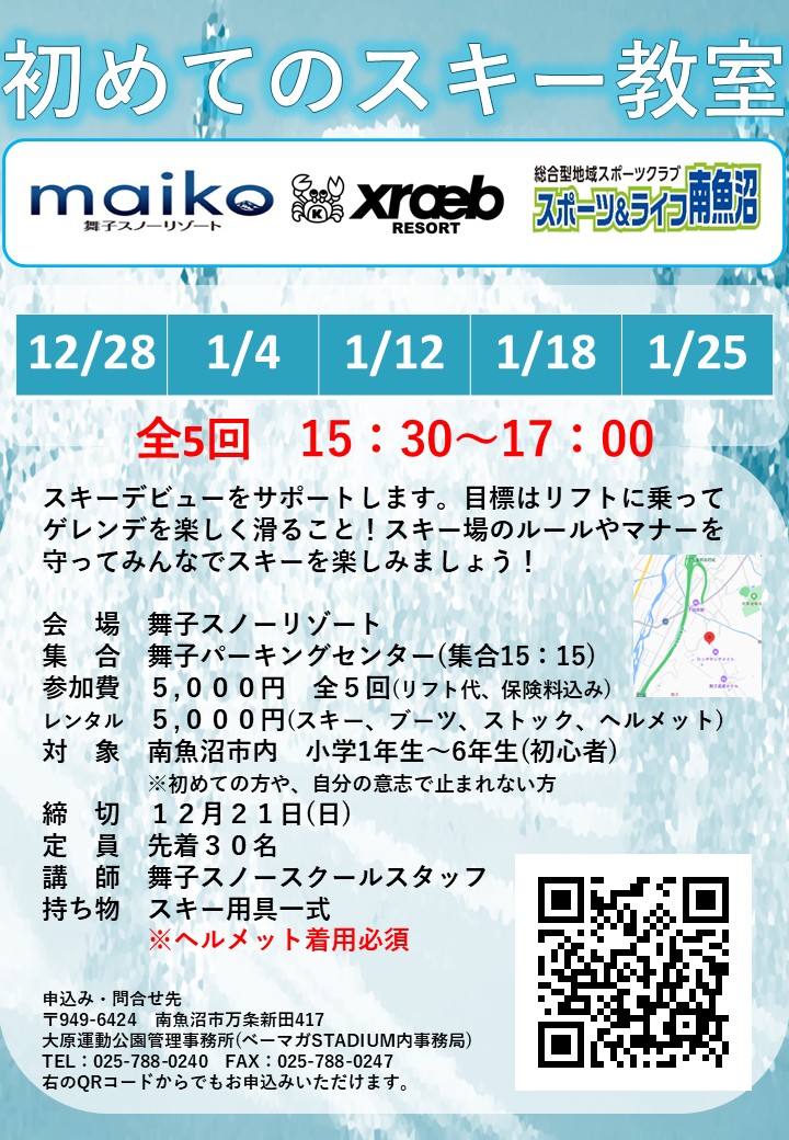 対 象:南魚沼市内小学1~6年生 初めてスキーをする方、自分の意志で止まれない方